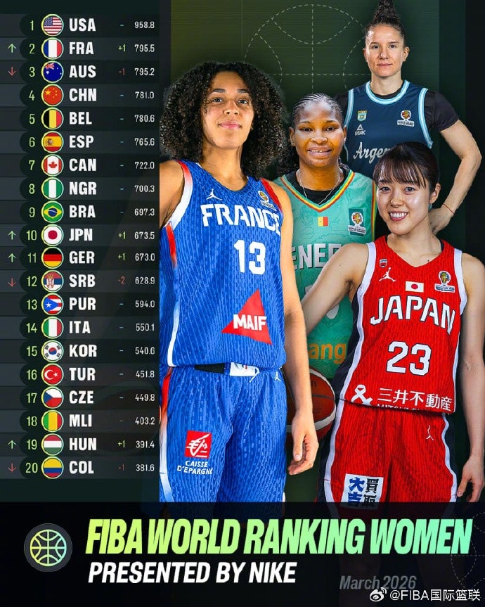 - 女篮世界排名更新:中国女篮继续位列第4 美法澳前三